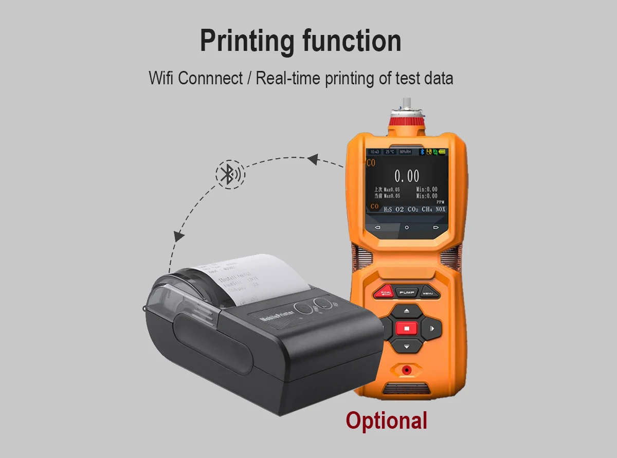 High-precision temperature and humidity measurements (optional configuration). Real-time detection or timing detection is supported; when no detection will be done, it is possible to shut down the pump so as to extend the startup time. Multiple alarm modes, and multi-directional and three-dimensional indication alarm states.It includes sound & light alarm, vibration alarm, display screen visual alarm.Alarm types include: concentration alarm, under-voltage alarm, and failure alarm. Multiple alarm mode settings: low alarm, high alarm, interval alarm, and weighted average alarm. Mis-operation recognition function: automatic recognition and prevention of the concentration calibration mis-operation, which is possible to avoid the poor performance that may be caused by human factors.